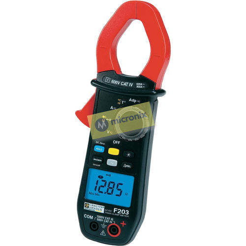 F203 je digitální klešťový TRMS multimetr, který umožňuje přesné měření efektivní hodnoty AC napětí a proudu a rozběhových proudů. Další vlastnosti a funkce: max. čítání 6 000 dig; průměr kleští 34 mm; TRMS AC; True InRrush; automatické rozsahy 0,15 až 600 A AC/DC; 0,15 až 1 000 V AC/CD; automatická detekce AC/DC; funkce Min/Max/Hold/Peak+ / Peak-/REL ΔX / Differential ΔX/X (%); měření odporu; nastavitelný test spojitosti s akustickou signalizací; test diod; měření frekvence (5Hz~3kHz pro proud, 5Hz~20kHz pro napětí).