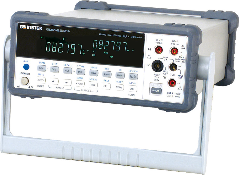 GDM-8255A je stolní multimetr: VFD duální displej 5 1/2 dig. - 199999 čítání; základní přesnost 0,012% (UDC); vzorkování 10x/s (5 1/2 dig.), 30x/s (4 1/2 dig.), 60x/s (3 1/2 dig.); měření TRUE RMS; 9 hlavních a 10 pokročilých měřicích funkcí. Měření UDC, UAC, IDC, IAC, R, T, f, spojitosti, diod; funkce Max, Min, dBm, dB, REL, Hold, Compare, Store, Recall; 2/4 drátové měření odporu; manuální nebo automatické přepínání rozsahů; bezplatný software (DMM-VIEWER), LabVIEW Driver; scanner GDM-SC1 (16+2 kanálů) - opt., pouze pro GDM-8255A; kalibrační klíč GDM-01; rozhraní USB, RS-232C, Digital I/O. Rozměry a hmotnost: 265 x 107 x 350 mm; cca 2,6 kg.