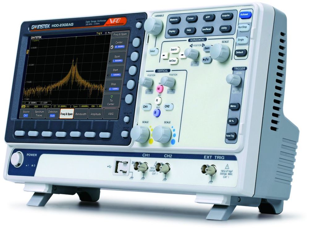 MDO2302AG je dvoukanálový MDO (Mixed Domain Oscilloscop) osciloskop/spektrální analyzátor.