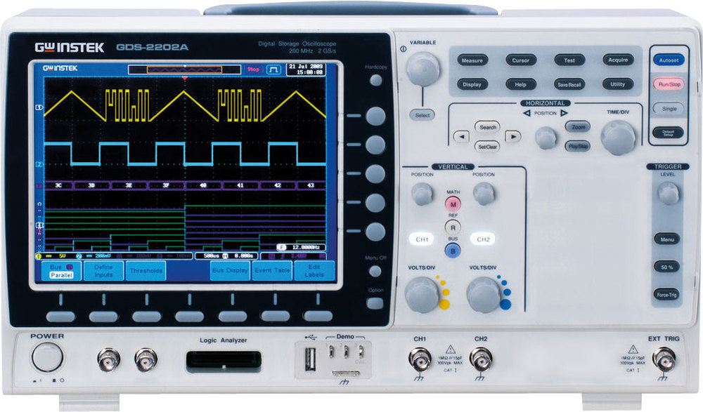 GW Instek GDS-2202A je 2kanálový osciloskop s šířkou pásma 200 MHz, vzorkování až 2 GSa/s v reálném čase (až 100...