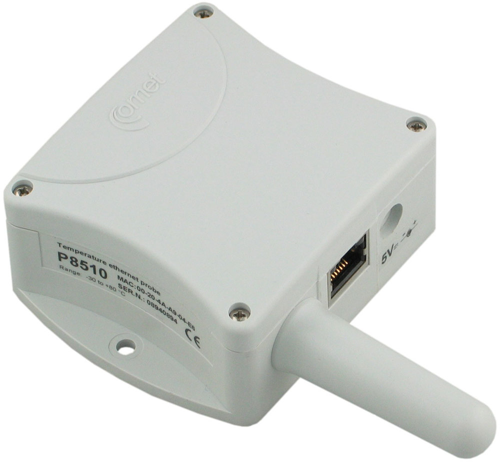 Snímač teploty s výstupem na Ethernet; rozsah -30 až +80°C, přesnost ±0.8°C; rozlišení 0,1°C; interval měření 2 s; možnosti komunikace: ModBus TCP, Telnet, www stránky, SNMP, SOAP; možnosti signalizace alarmu: e-mail, www stránky, SNMP, syslog; rozměry a hmotnost: 88 x 126 x 39,5 mm, 240g