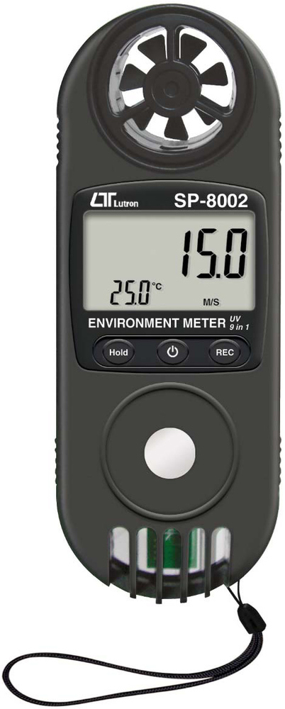 LUTRON SP-8002 je měřič životního prostředí - 9 přístrojů v jednom. Přístroj měří rychlost větru, teplotu, relativní vlhkost, průtok vzduchu, UV záření, rosný bod, teplotu mokrého teploměru (Wet bulb), Wind chill, teplotní index a teplotu s termočlánkem PT 1000 (sonda je volitená).