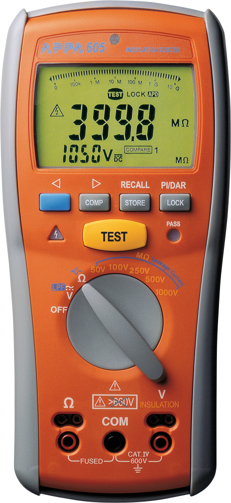 APPA 605 je digitální tester izolačního odporu v rozsahu 0,01MΩ ~ 20GΩ; velký duální displej s čítáním 4000; 48-segmentový analogový bargraf; testovací napětí: 50V, 100V, 250V, 500V, 1000V; automatická detekce AC/DC napětí; automatický výpočet polarizačního indexu a dielektrického absorpčního poměru; paměť pro uložení a vyvolání naměřených hodnot; funkce porovnávání (test vyhověl / nevyhověl); měření odporu v rozsahu 0,01Ω ~ 20kΩ; automatické vypínání přístroje; včetně sondy s dálkovým ovládáním, testovacích vodičů, krokodýlků a magnetického držáku.