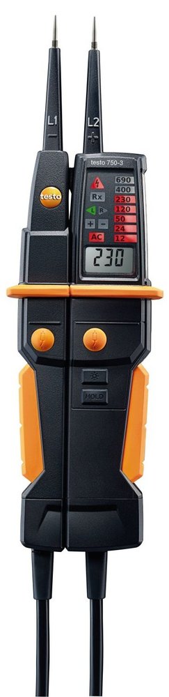 Zkoušečka napětí testo 750-3 je aktuálně nejmodernější zkoušečka napětí na trhu. Přehledný, 3-stranný LED displej s unikátní optikou světlovodu, pro ideální zobrazení indikace napětí, lze odečítat z jakéhokoliv úhlu. LC displej navíc zobrazuje měřenou veličinu číselně. Protiskluzový límec a ergonomická rukojeť Vám zajistí pohodlnou práci s přístrojem. Testo 750-3 je díky robustnímu provedení velmi odolné a spolu s integrovaným osvětlením měřeného místa umožňuje měřit i za snížených světelných podmínek.