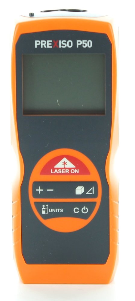 PREXISO P50 je jednoduchý laserový dálkoměr - rozsah měření 0,01 až 50 m, typická přesnost ±2 mm. Sčítání a odčítání délek, sledování (průběžné měření), plocha, objem, Pythagorova věta.
